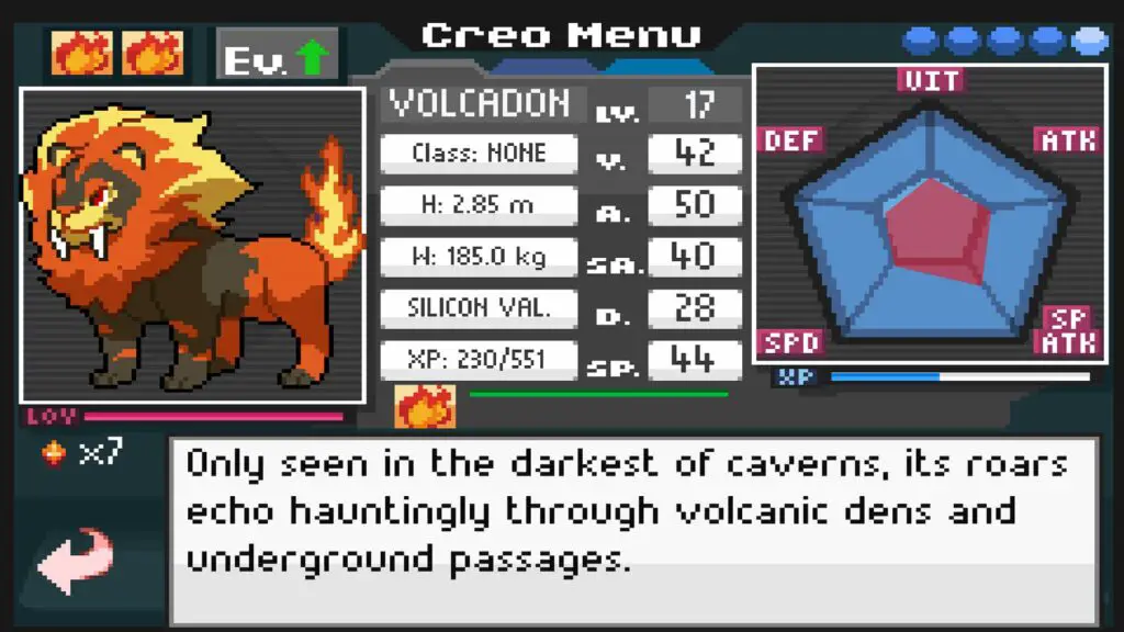 My choice was Rebas, which is a small lion, who I eventually evolved into the fire-type, Volcadon. While I like the ability to essentially choose your starter’s evolution on the fly, I feel it’s a little more railroaded at the beginning. Outside of the normal scratch move, my first attack ability my Rebas learned was Kindle, a fire move, so just because I was using the only elemental attack available to me, my Creo evolved down the fire route.