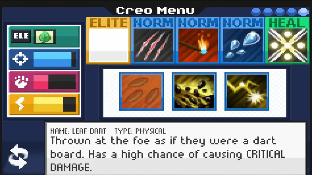 The one area where EvoCreo tries to stand out from Pokémon the most is in its battles. Every Creo will have a total of five moves they can choose from in battle: one elite move, three normal moves, and a healing move. As you might expect, the elite move is the most powerful, but there is a push-and-pull here because the more powerful a move, the more it is going to need to recharge before you can use it again. This isn’t a situation where you can continuously spam your best move to take down the opposition.